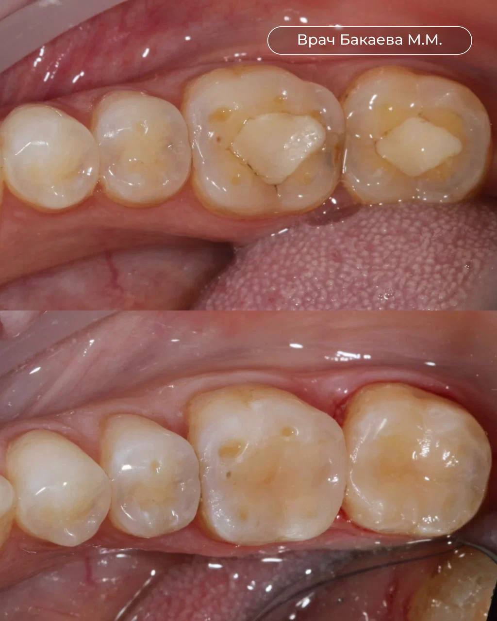 На фото «до» мы видим несостоятельные пломбы на жевательной поверхности зубов 4.6 и 4.7 и кариозный процесс на контактных поверхностях.
