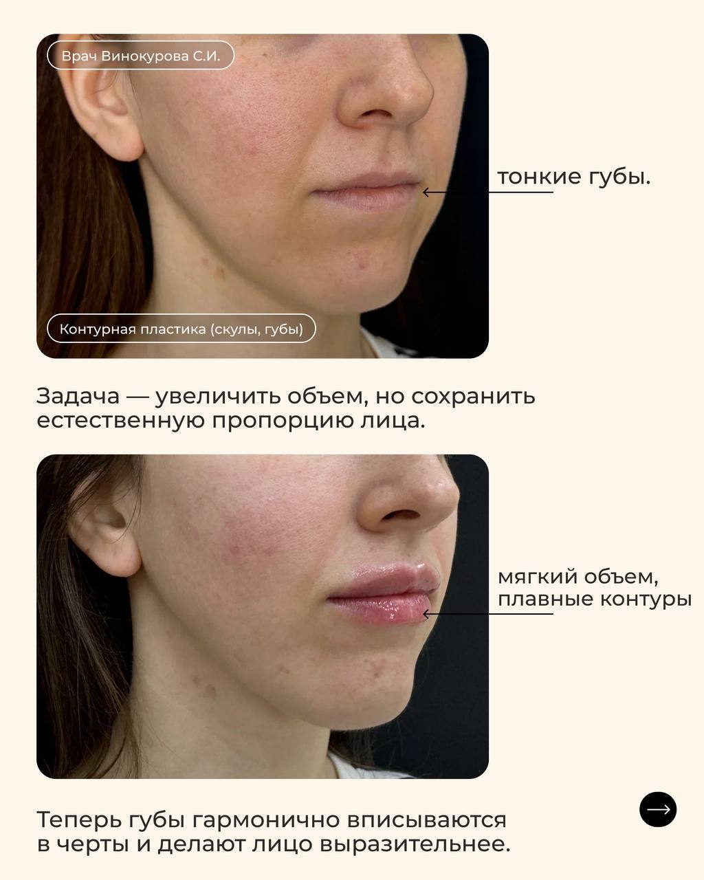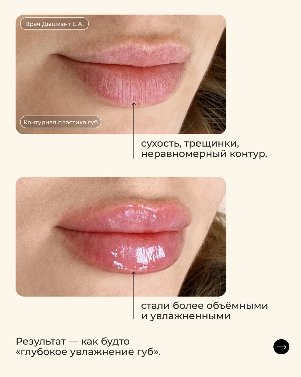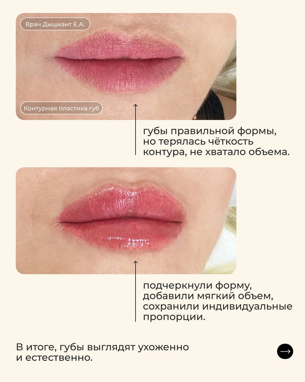 Результат — красивые губы и гармоничные черты лица, которые выглядят выразительно и естественно.